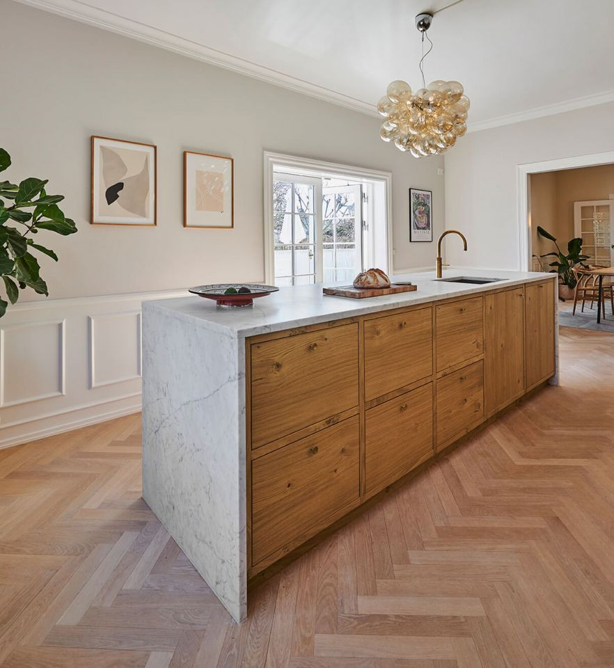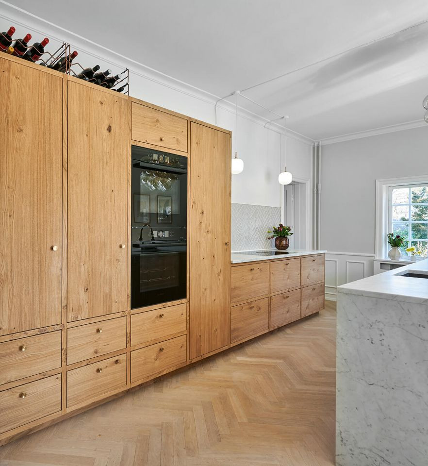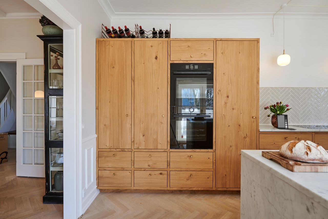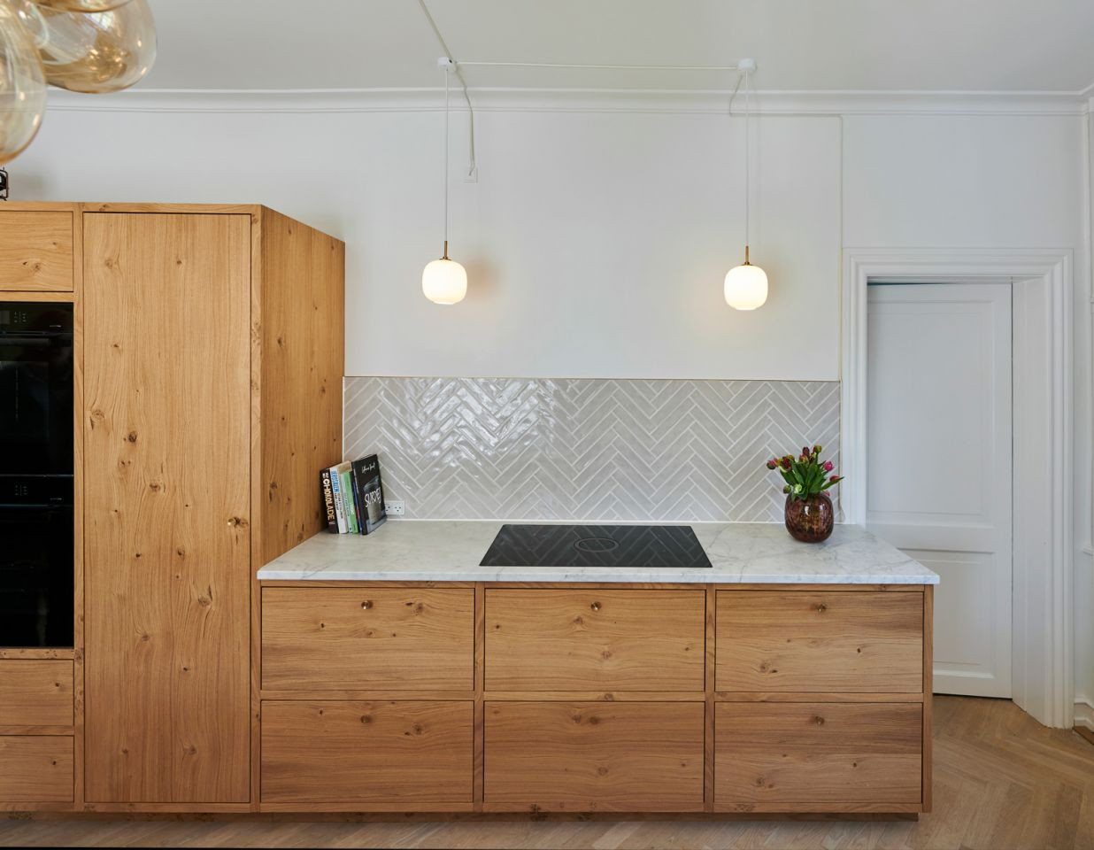 Ejerne ønskede noget mere end bare et almindeligt egetræslook. Finéren blev nøje udvalgt sammen med bordpladen i hvid marmor. Begge dele kompletterer det smukke sildebensgulv på fornemste vis.